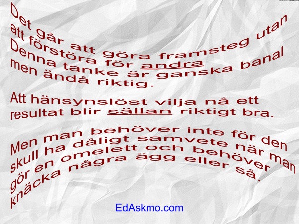Man kan lätt sabba för andra fast det inte vara avsikten att det skulle bli så. Det man ser ganska mycket av är att folk vill ta för sig på mer eller mindre legitima grunder. Men även om ens avsikter är sunda och ok så behöver man tänka sig för utan att bli nojig för den skull. *Gör gott för mer än bara sig själv* skulle kunna vara något slags hyfsat sunt ordspråk att försvara inom sig själv och utåt.